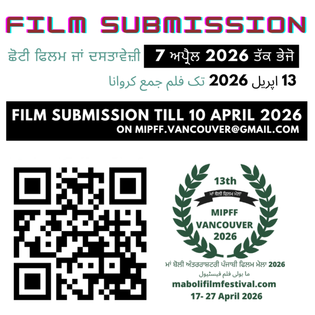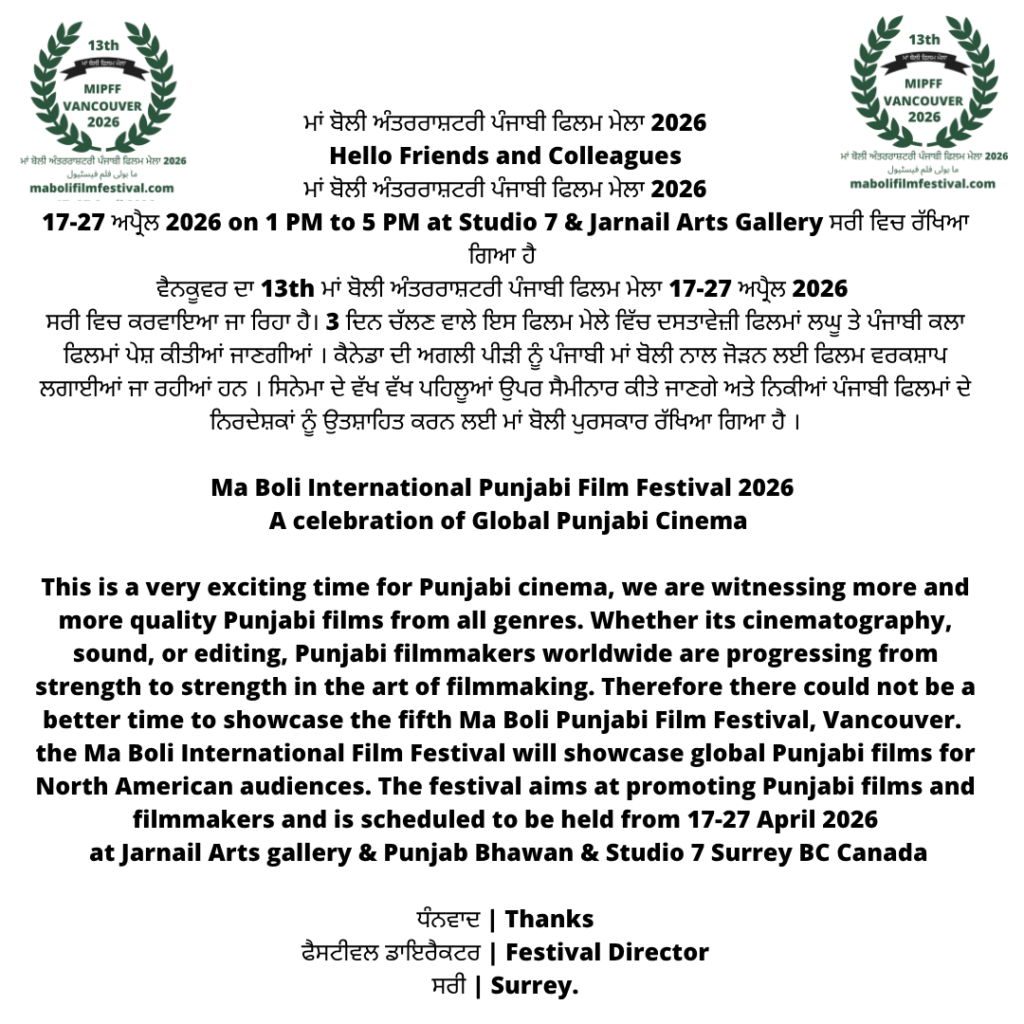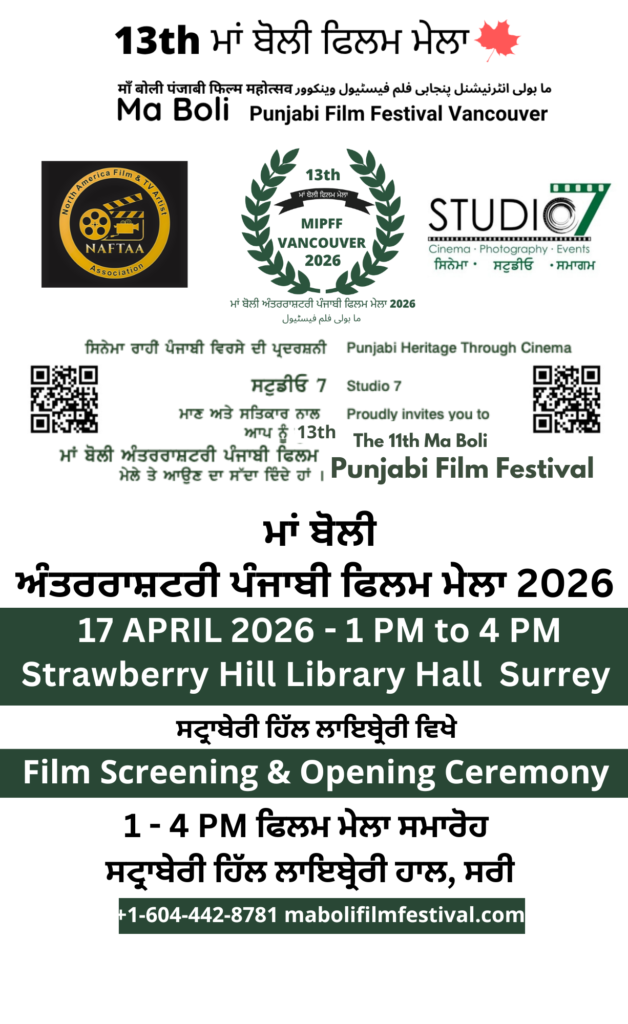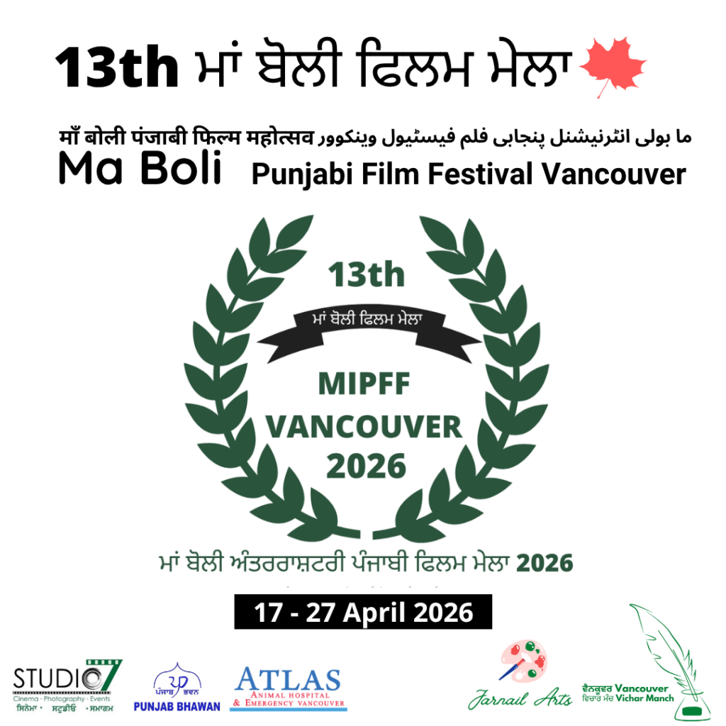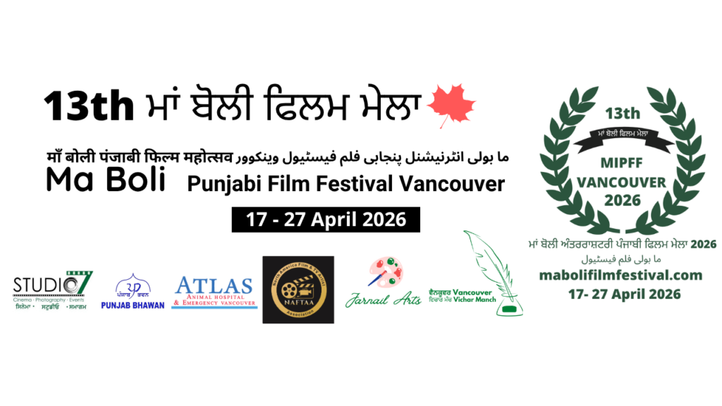 ਵੈਨਕੂਵਰ ਦਾ 13th ਮਾਂ ਬੋਲੀ ਅੰਤਰਰਾਸ਼ਟਰੀ ਪੰਜਾਬੀ ਫਿਲਮ ਮੇਲਾ 17-27 ਅਪ੍ਰੈਲ 2026 ਸਰੀ ਵਿਚ ਕਰਵਾਇਆ ਜਾ ਰਿਹਾ ਹੈ।